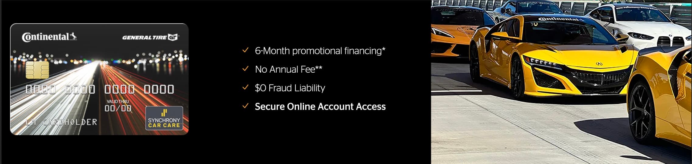 As a Continental Tire Credit Card cardholder, you can access discounts and receive promotional financing on qualifying purchases. Additionally, the card can be used for any purchase, for any brand, when you're shopping at SimpleTire.